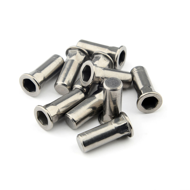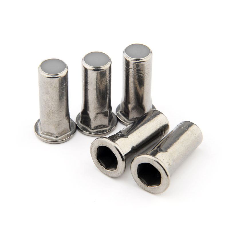 六角拉鉚螺母的安裝方式與普通鉚螺母的安裝方式完全一樣,只是板孔需要沖成相適配的六角形。