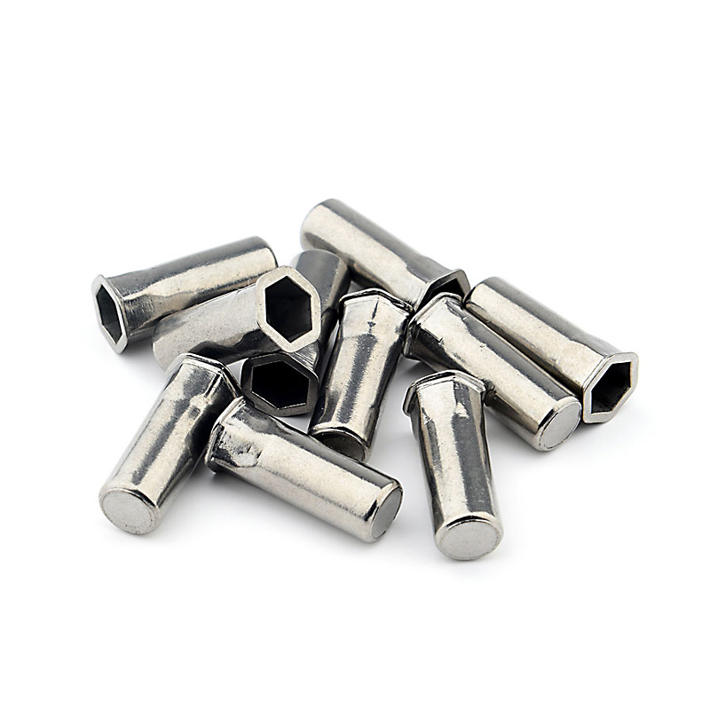 六角拉鉚螺母的安裝方式與普通鉚螺母的安裝方式完全一樣,只是板孔需要沖成相適配的六角形。