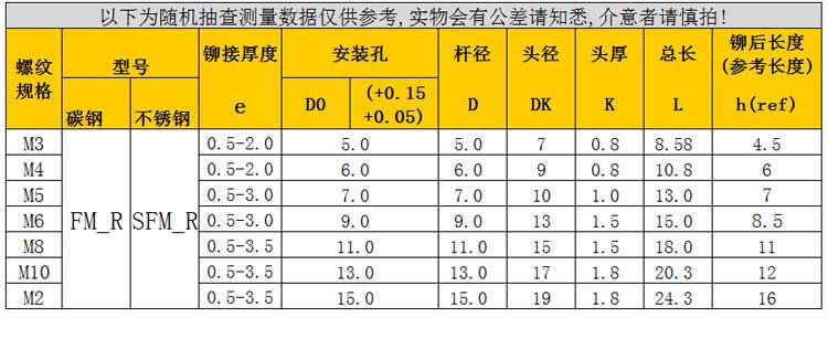 通孔平頭豎紋拉鉚螺母M3-M12區(qū)別: 平頭拉鉚螺母及其技術(shù)參數(shù),其圓柱端分為光桿和柱紋兩種,鉚接后其頭部外露于薄鈑,其柱紋可起防滑的作用,平頭拉鉚螺母也是拉鉚螺母中比較牢固比較常用的一種。鍍彩鋅通孔平頭豎紋拉鉚螺母M3-M12簡介: 拉鉚螺母又常常被稱為鉚螺母、拉帽、瞬間拉帽等名稱,被應(yīng)用于各類金屬板材、管材等制造工業(yè)的緊固領(lǐng)域,目前廣泛地使用在鈑金/薄鈑/機(jī)箱機(jī)柜上。拉鉚螺母是為解決金屬薄板、薄管焊接螺母易熔,攻內(nèi)螺紋易滑牙等缺點(diǎn)而被研制開發(fā)的產(chǎn)品。