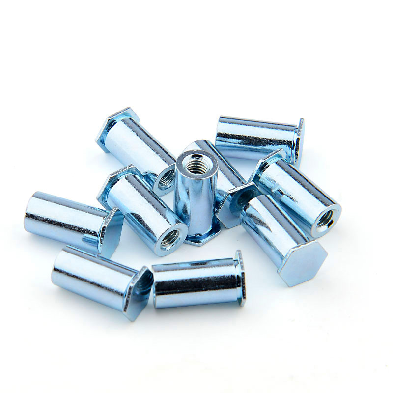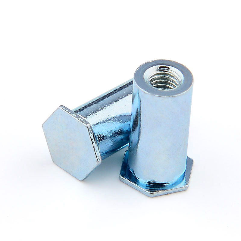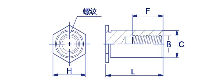 應用于鈑金、薄板、機箱、機柜的一種緊固件,壓鉚螺母柱其外形一端呈六角形,另一端為圓柱狀,六角邊與圓柱狀中間有一道退刀槽,其內形為內螺紋,壓鉚螺母柱通過壓力機將六角頭壓入薄板的預置孔內(預置孔的孔徑一般略大于壓鉚螺柱的圓柱外徑)使孔的周邊產生塑性變形,變形部分被擠入壓鉚螺母柱的退刀槽內,使壓鉚螺母柱鉚緊于薄板上,從而在薄板上形成一下有效固定的內螺紋。